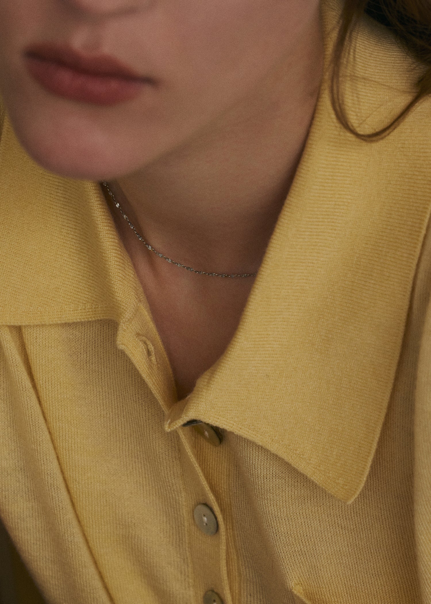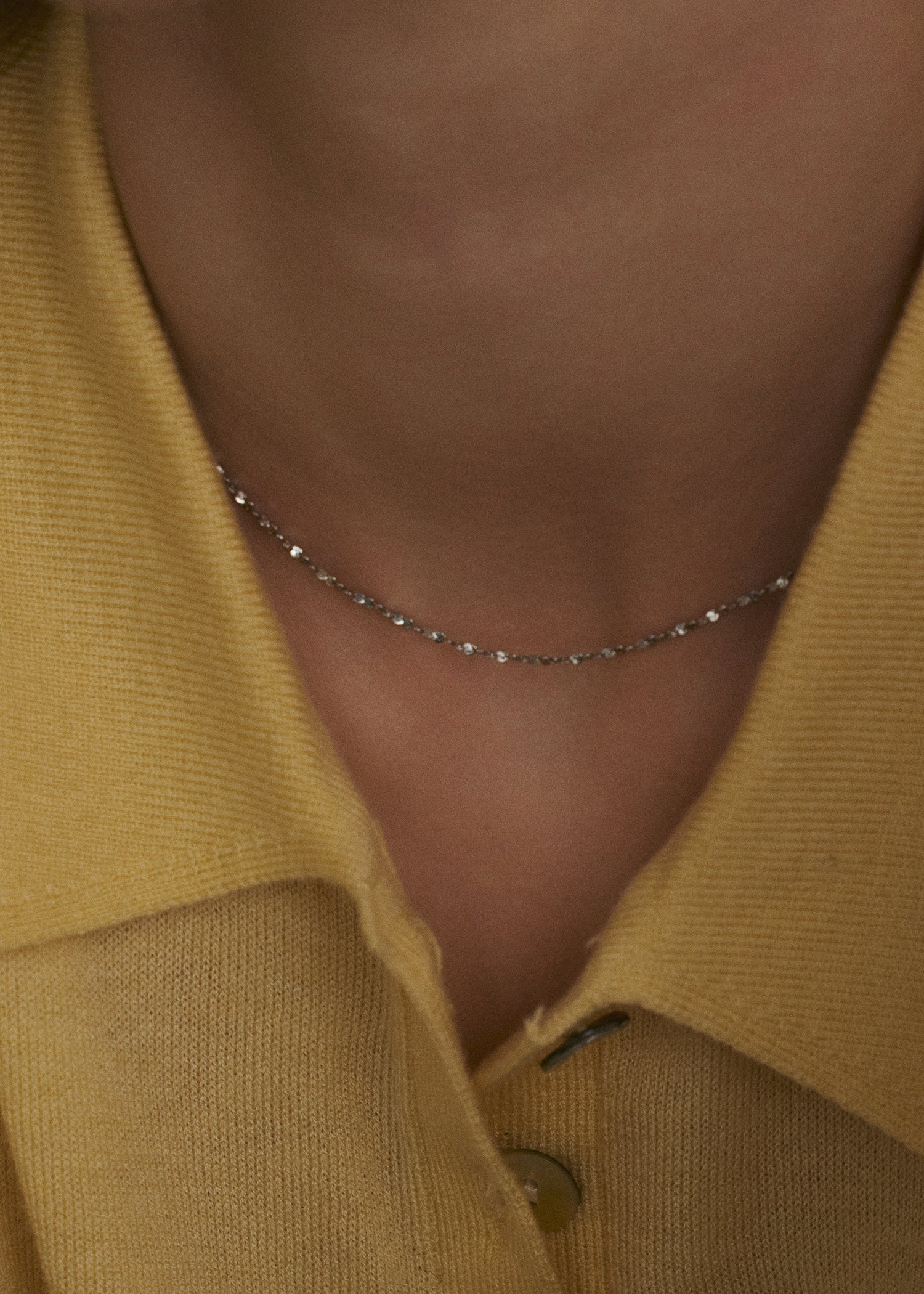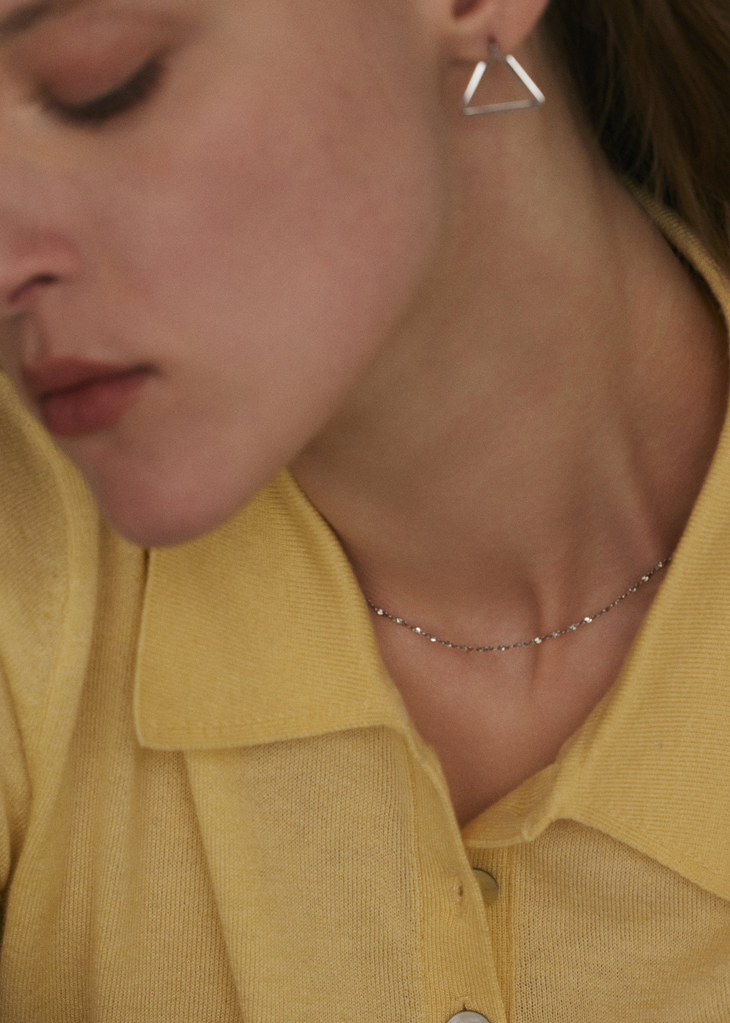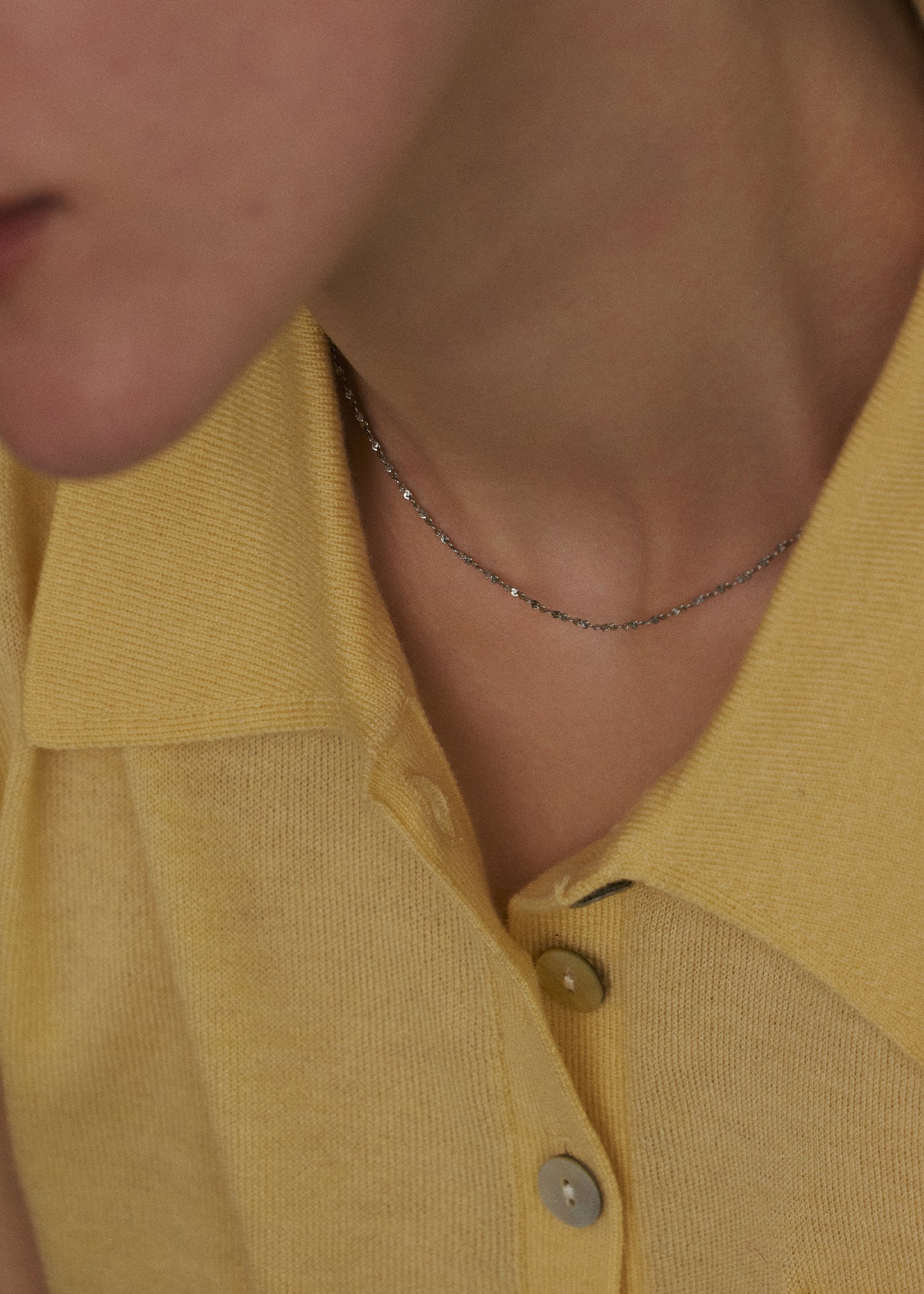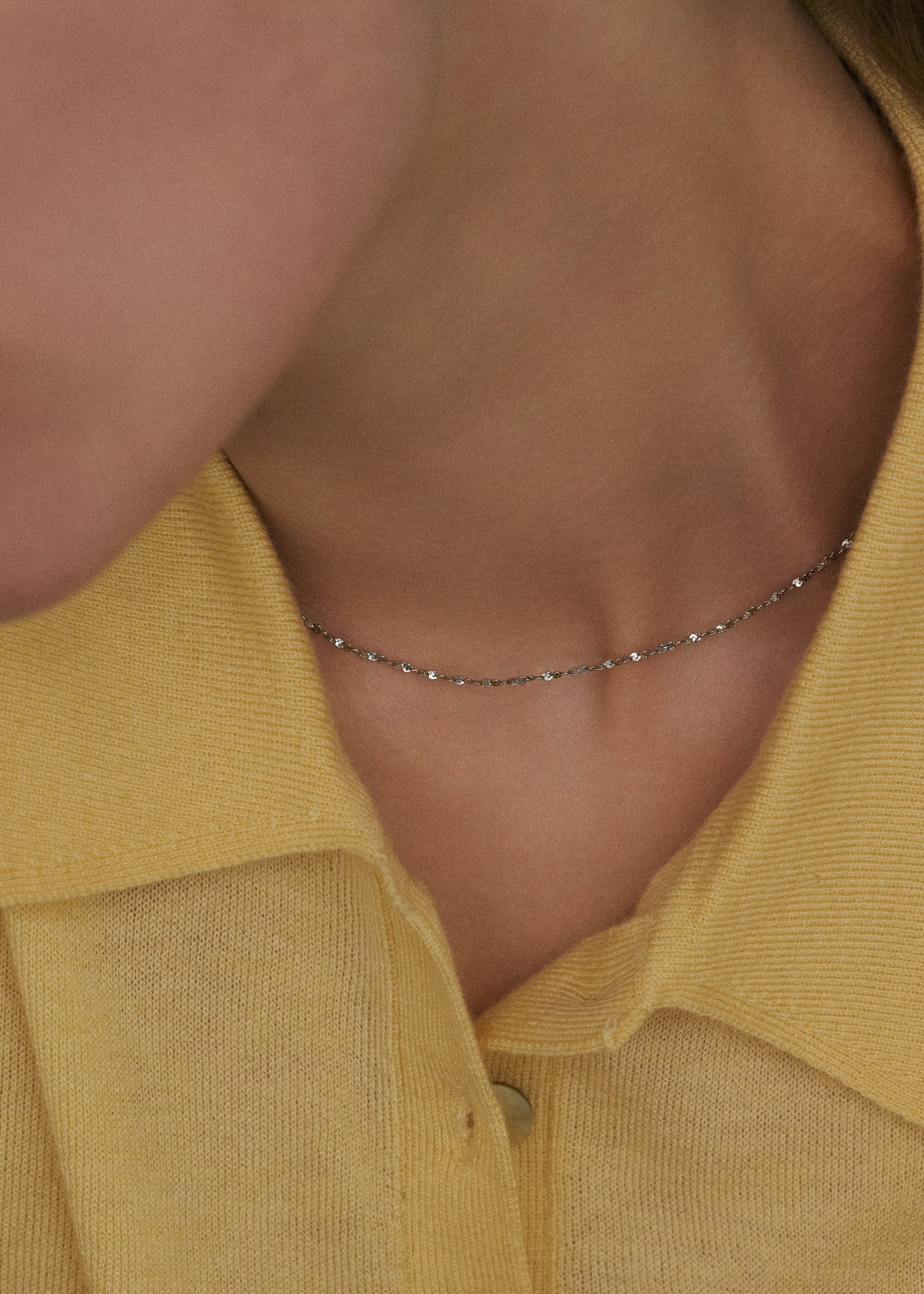 繊細なリズムでカットが施された小さなプレートが連なる「リーフネックレス」。光を拾うたびに細やかな輝きを放ち、顔まわりを明るく引き立ててくれるミニマルなデザインが魅力です。チョーカーのような短めの長さで、襟元やデコルテラインにさりげなく寄り添いながらも存在感を放ちます。