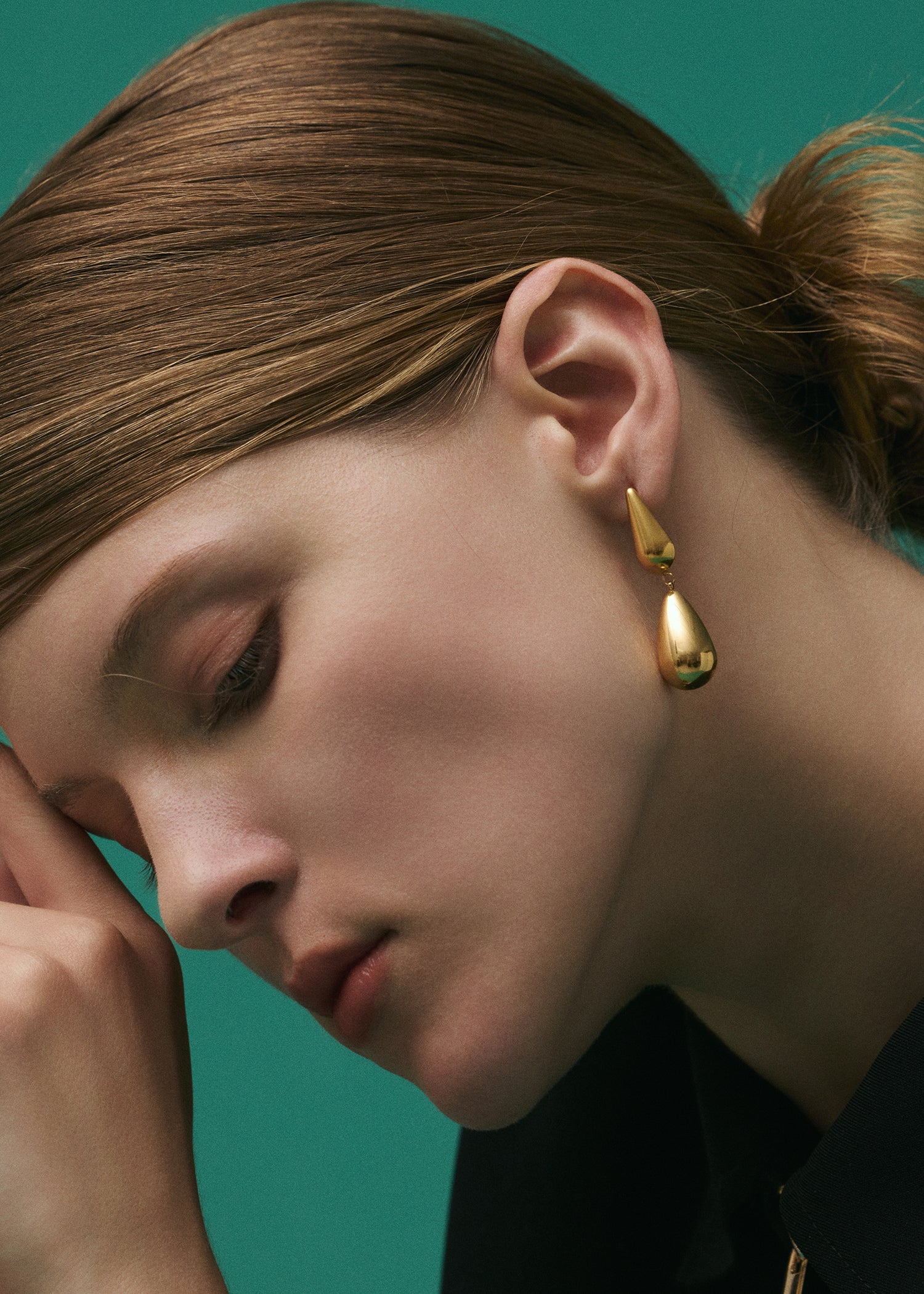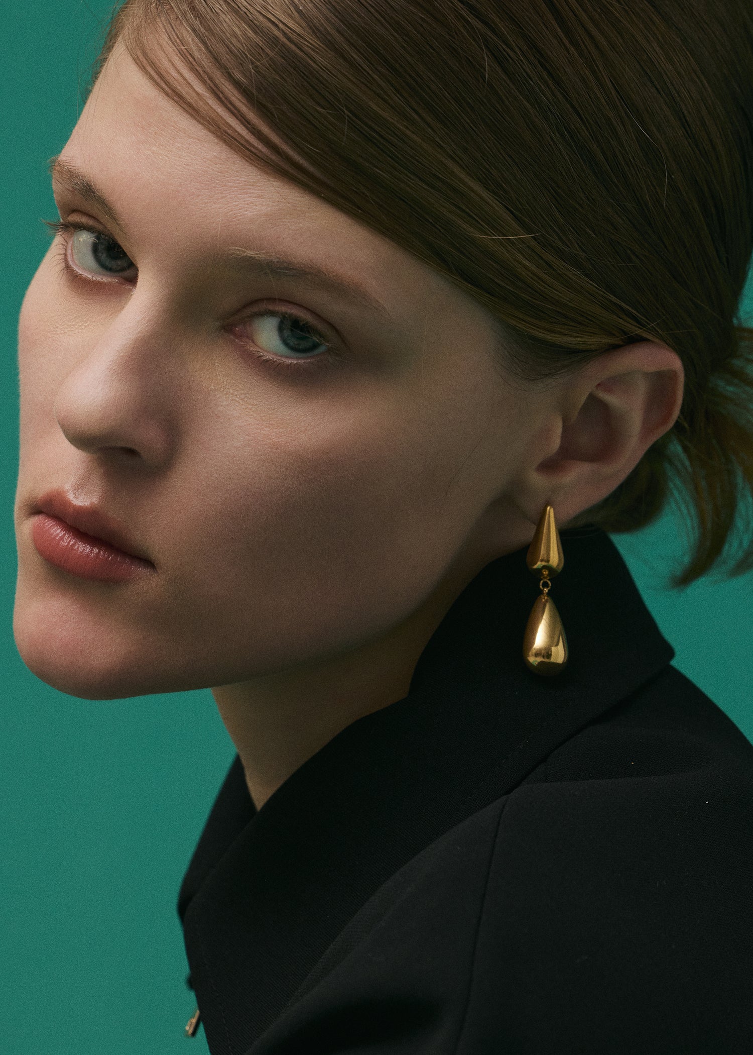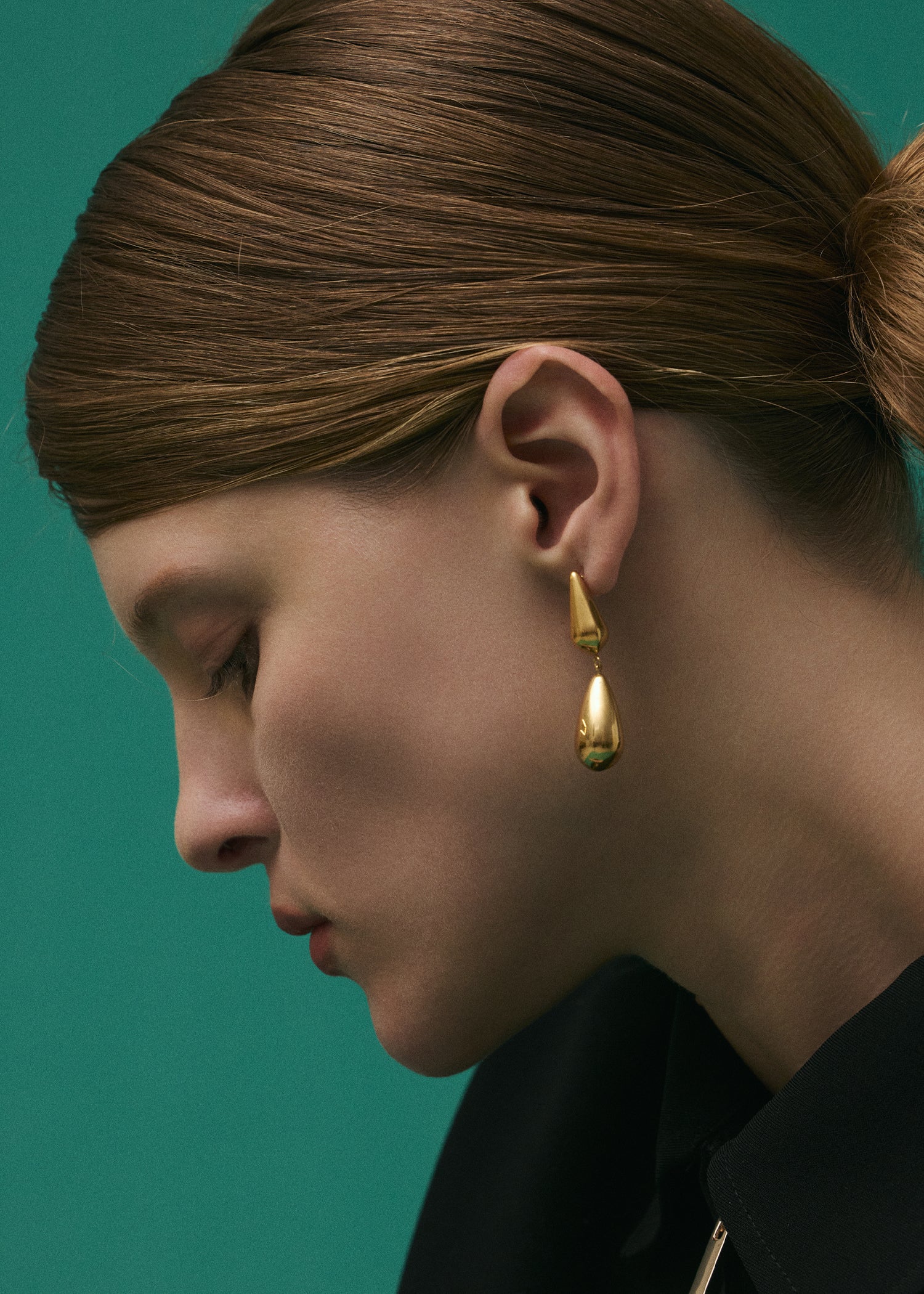 雫が連なったような2つのパーツが、静かな存在感を放つ「ダブルドロップピアス」。上品なツヤ感がありながら、軽やかな着け心地が魅力です。ひと粒目は控えめに、ふた粒目はしっかりと揺れて、動きのあるシルエットを演出します。